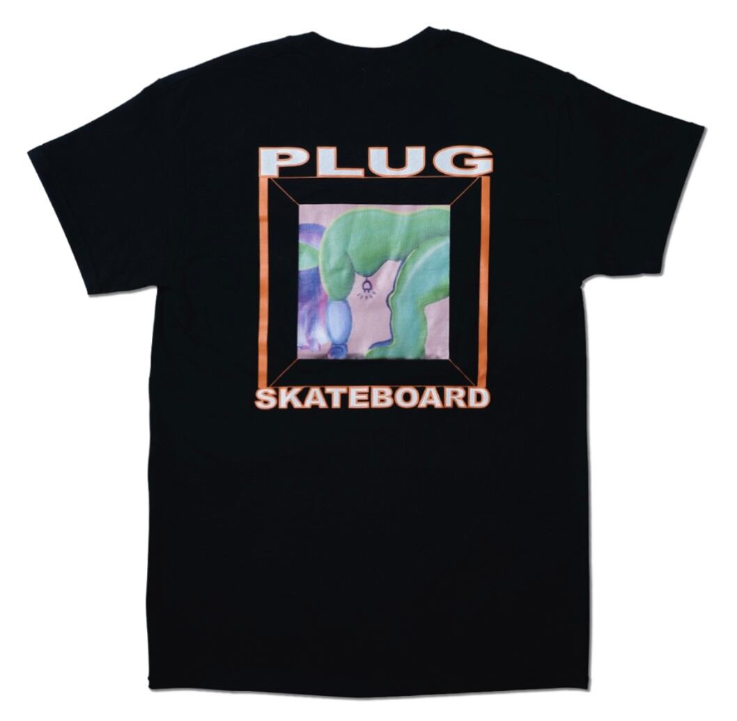 Plug Girl けだるそうな女の子を描いたデザイン。おっぱいがプラグになってるのでプラグガールです。 バックプリントは2種類の印刷方法を用いて、奥行きが出るようなデザインになってます。
